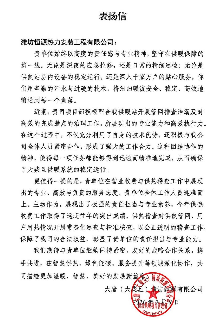 随慰问一同送达的表扬信中,大唐海西州事业部对大柴旦项目部的工作成效给予了高度评价:无论是深夜应急抢修还是精细化巡检,潍坊恒源热力团队始终以高效执行力确保供热系统安全稳定运行,近期配合开展的管网治漏工作迅速精准,展现出过硬的专业能力与协作精神,供热收费工作取得历史性突破,稽查工作以公正透明维护企业权益,彰显责任担当。
